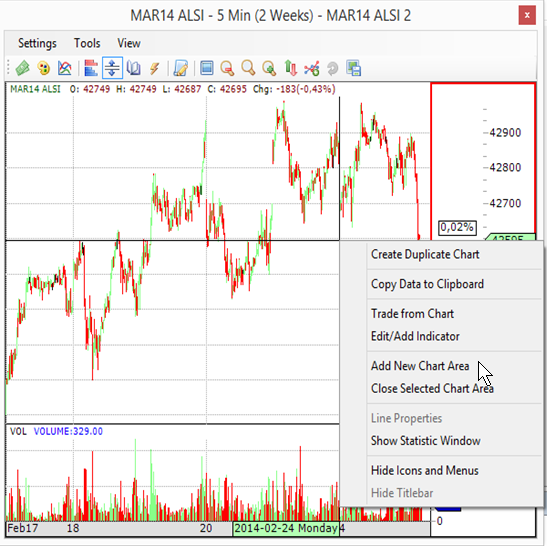 •Open a chart. The image below shows the two default chart areas and the context menu as a result of right-clicking on a chart area.