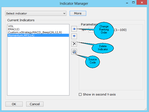 •The Indicator Manager is displayed. Click on Select to add new indicator or click on More button to show a list of indicator.