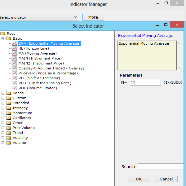 •Select one or more indicators to add and click on OK. Note that multiple indicators selected here will display in the same chart area. Use the