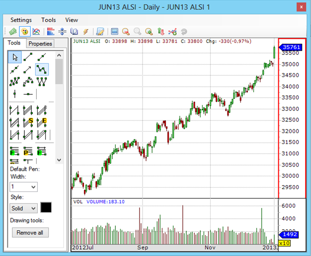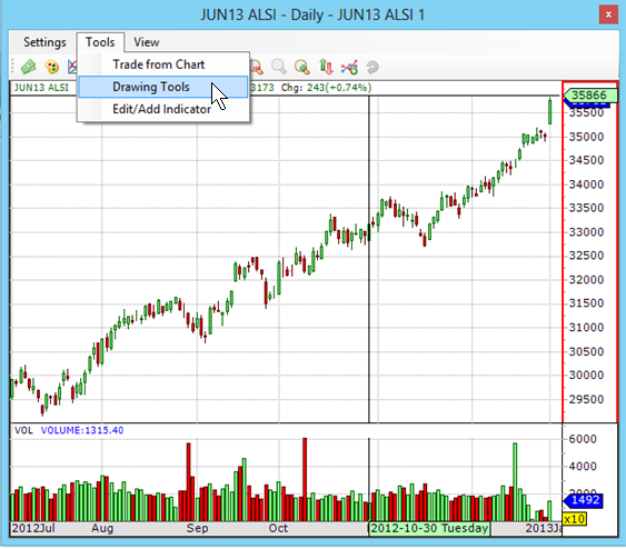 •Open a chart. Click Tools > Drawing Tools menu item at the top of the chart window.
