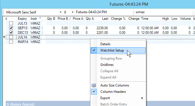 •On completion of your instrument selection, right-click the mouse and click the Watchlist Setup menu item.