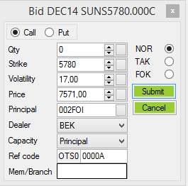 Select Call or Put, enter values for Qty, Strike and Volatility and other relevant fields. Click on Submit to have the order created. If the order did not immediately trade click on Swordfish menu View > Active Orders to view the orders.
