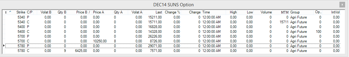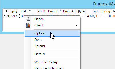 Click on the Option menu item to see the Option window. Select the appropriate Strike instrument. Orders can be submitted by clicking on any of the following quantity cells: Bid Quantity with column header Qty (B), Bid Price with header Price (B), Ask Price with header Price (A), Ask Quantity with header Qty (A). Clicking on the bid quantity or bid price for a particular instrument will open a Bid dialog box and clicking on the Ask quantity or Ask Price will open an Ask dialog box.