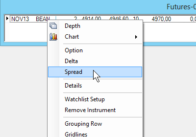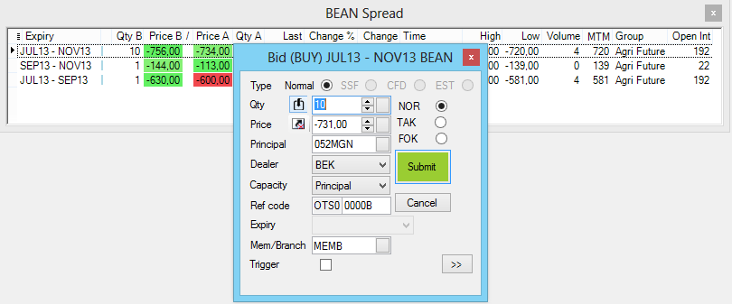 4.Select the appropriate spread. Orders can be submitted by clicking on any of the following quantity cells: Bid Quantity with column header Qty (B), Bid Price with header Price (B), Ask Price with header Price (A), Ask Quantity with header Qty (A).