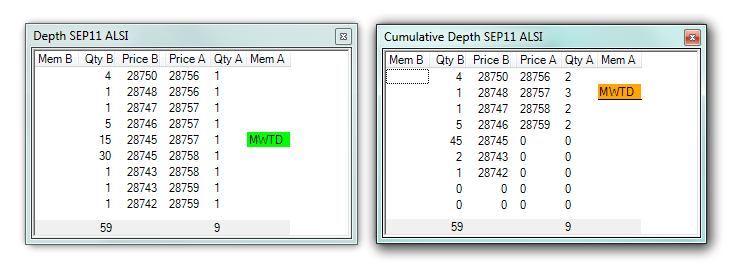•Whenever you open a Depth window, the color green means that the login member has an active order in at that row. This is found in a Normal and Cumulative Depth window. •The color orange (only found in cumulative depth) means the login member has an active order at that price, but at a fraction of the total sum of the depth line. •Additionally: Once the Cumulative Depth window has been opened, you can use the shortcut key F4, in order to toggle between the view of the normal and cumulative depth windows.