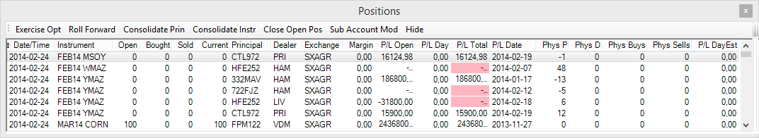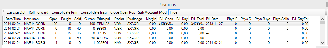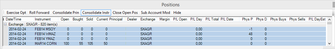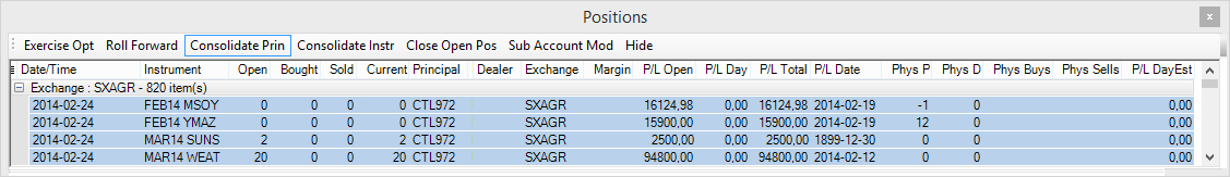 •Positions can be grouped in two ways. •The first option can be viewed by clicking on View > Positions > Consolidate Prin, from the menu bar at the top of Swordfish. •Positions will be grouped by exchange, principal and instrument.