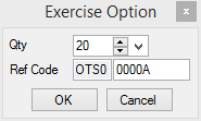 •The Exercise Option window displays for you to confirm or reduce the Qty field. Change the Ref Code value if required. •Click on OK to confirm the action.