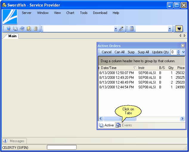 The Active Orders window is released and is docked with the Event Log and tabs indicated at the bottom of the window (highlighted by the balloon):