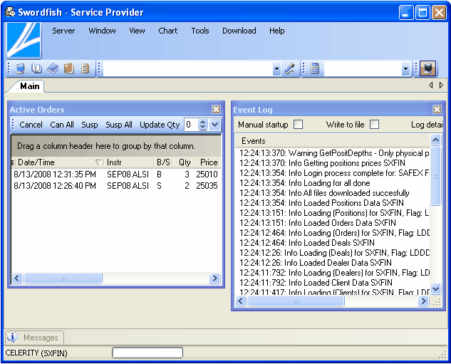 In the image below there are two undocked windows: 'Active Orders' and 'Event Log'.