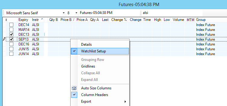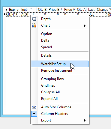 •Once Swordfish is open and connected to an exchange, select the watchlist window you wish to alter and right-click the mouse anywhere inside the window. This will display a pop-up menu; select Watchlist Setup.