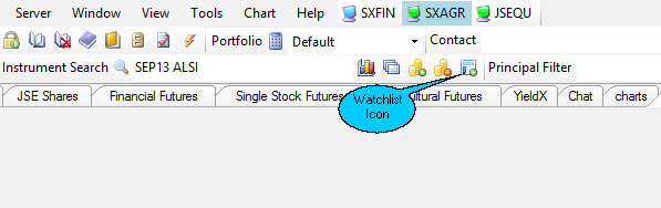 •A Watchlist can also be opened by typing the desired instrument in the Instrument search field e.g. alsi.