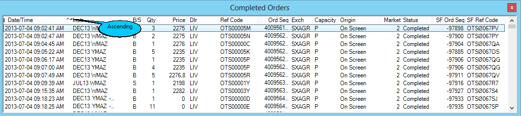 •In the next image, the data is sorted according to the 'Date/Time' column in ascending order and this is indicated by a normal triangle on the column heading: