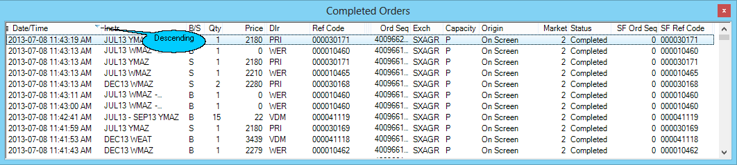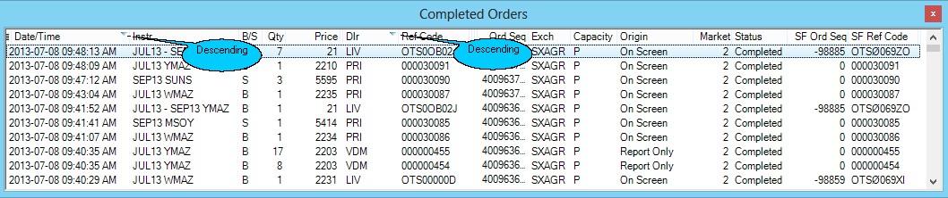 •Click on the column heading that you wish to sort the information by. In the image below the information is sorted according to the 'Date/Time' column in descending order. This means that the most recent date / time values will be at the top of the window. The sorting status of the column is indicated by an inverted triangle (highlighted by the balloon in the image below):