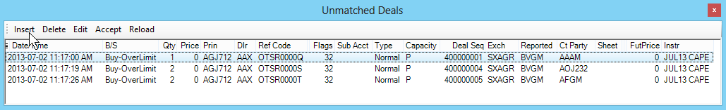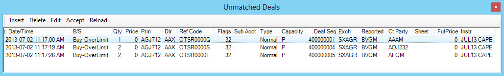 This section describes the actions that may be taken on Unmatched Deals. The Unmatched Deals Window can be used to insert, delete, accept and reload unmatched deals. Report Only Deals are off-screen deals done between two parties where they mutually agree on the details of the deal.