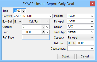 •Provide the values for required fields on the Insert Report Only Deal window. •When the required information is ready for submission to the Exchange , click the Submit button. •If the Deal was accepted by the Exchange see the Deal Entry in the Unmatched Deals window.