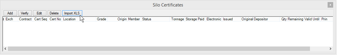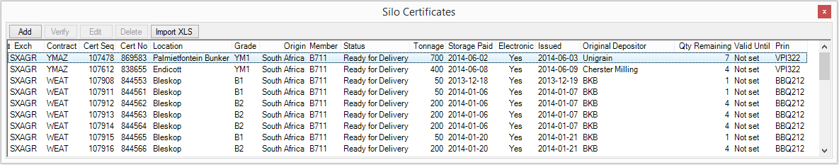 The Silo Certificates window can be used to add, edit, verify and delete Silo Spot Certificates. The window is also used to select a certificate when entering a silo spot ask/sell.