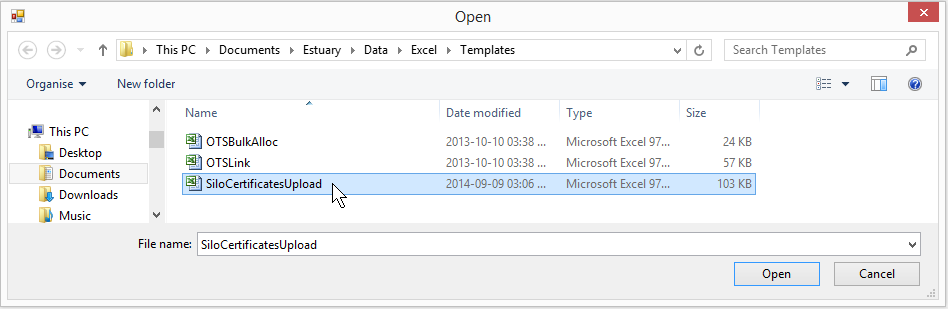 1.A template for Silo Certificate creation can be found in your Estuary folder : Documents\Estuary\Data\Excel\SiloCertificatesUpload.xls 2.Prepare the Excel sheet for importing by filling out the relevant information. 3.Once the Excel sheet is ready, open the Silo Certificate window by selecting View > Silo spot basis > Silo Certificates from the menu bar at the top of Swordfish. 4.Click the Import menu item on the Silo Certificates window for the Silo Certificate Excel spreadsheet to appear as illustrated below.