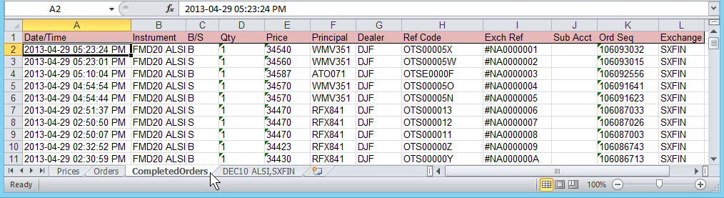 •Any orders that are completed post-opening of sfExcel will also be output to the CompletedOrders sheet. This however is optional, and since the Orders sheet gives status feedback already, you may delete the CompletedOrders sheet.