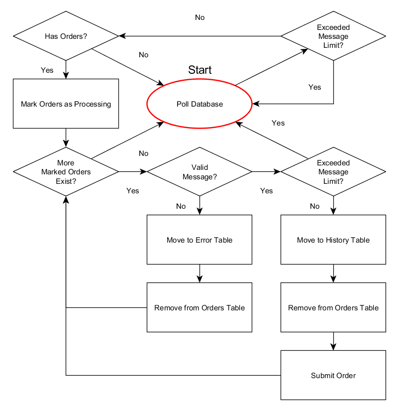 Use only the given stored procedures to access the database. Do not manually edit orders marked as processing. Do not enter rows into the database manually to insert an order. Doing so will cause unpredictable results.