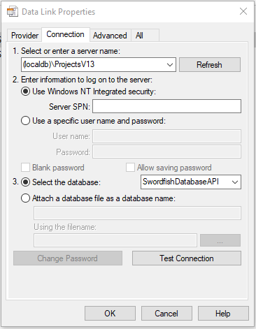 Provider=MSOLEDBSQL; Integrated Security=SSPI; Persist Security Info=True; Initial Catalog=SwordfishDatabaseAPI; Data Source =(localdb)\ProjectsV13;