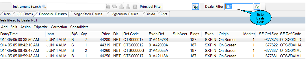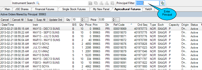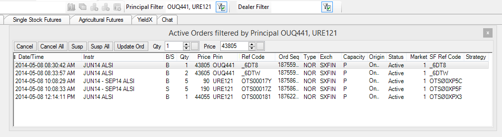 This functionality is useful for brokers that need to find relevant client information. The Swordfish windows of Active Orders, Completed Orders and Deals are filtered by the filter criteria in the Principal Filter or the dealer filter Tool.