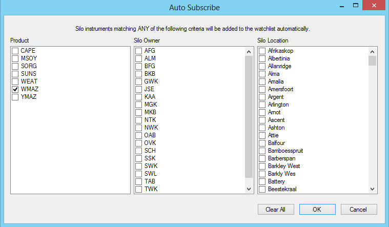 For example if you select product WMAZ and Silo Owner AFG, all WMAZ contracts and all contracts who's owners are AFG will be auto subscribed to.