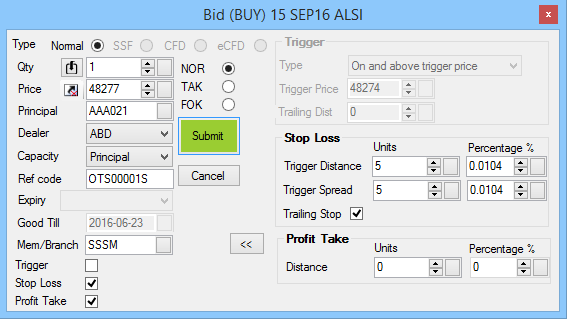 2. Swordfish Stop Loss (Order Window Stop Loss). If you prefer Swordfish to handle the process for you, the order Order Place Box has Stop Loss and Profit Take options:
