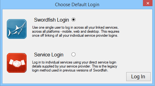 •Select the Swordfish Login radio button as illustrated above and click on login. This sets the default login screen – all login menu items and buttons will now open the Swordfish login screen by default. This can be changed at any time in the Configure Login screen.