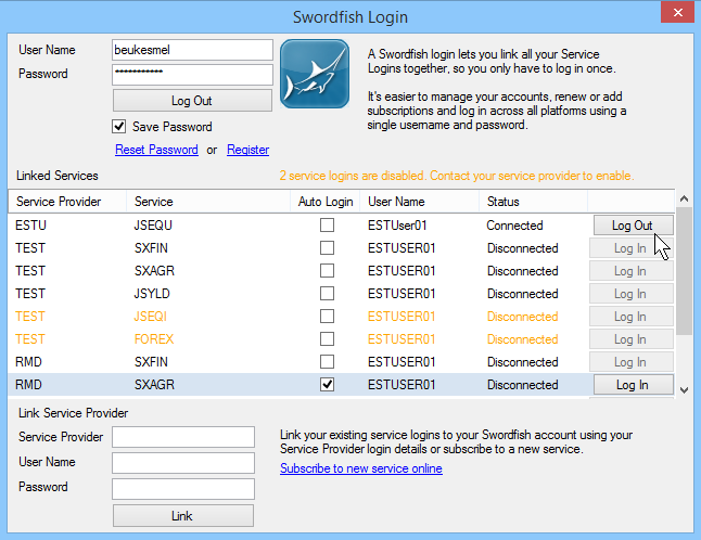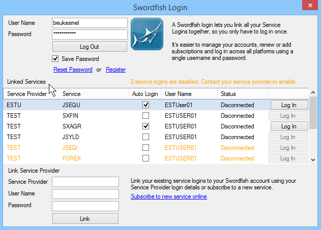 Once successfully logged in, you can link your service provider logins. In the “Link Service provider” section, enter your service login details - service provider, username and password. Now click on “Link”. If the service login credentials are valid, your service login will be linked and appear in the “Linked Services” list. Once linked, “Auto Login” needs to be selected to allow the service to log be used from the front-end. When logging in using your Swordfish Login in future, these selected services will automatically connect.