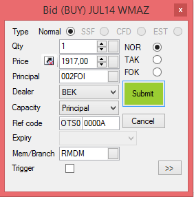 •The F2 key on your keyboard opens a Bid placement dialog box. Select the instrument by highlighting it in the watch list window and press F2. The keyboard shortcut can also be activated from a depth window.