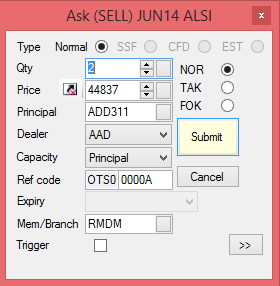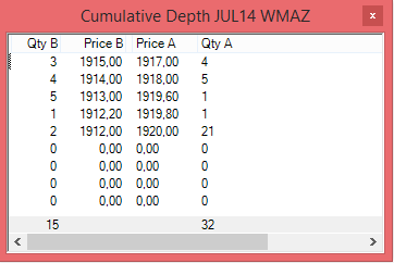 •Ctrl-Shift-F2 – Delete all Bid orders that relate to the Instrument’s Group I.e. using this keyboard shortcut on a selected ALSI instrument will delete all bid orders for all Instruments that relate to the group “Index Futures”. An instrument’s group is the value in the Watchlist’s column named “Group”. Select the instrument by highlighting it in the watch list window and press Ctrl-Shift-F2. The keyboard shortcut can also be activated from a depth window.